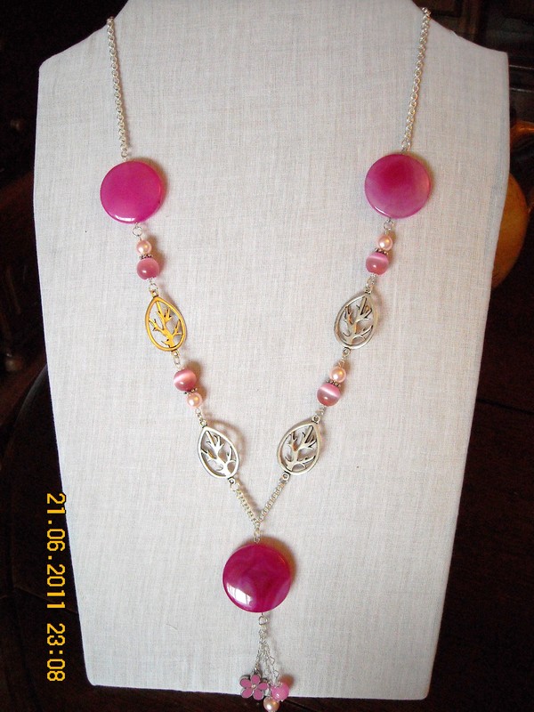 SAUTOIR DE VRAIES AGATES ROSE FUSHIA,PLATES ET RONDES.PERLES OEIL DE CHAT ROSE ET JOLIES FEUILLES ARGENTEES VIENNENT REHAUSSEES LE TOUT